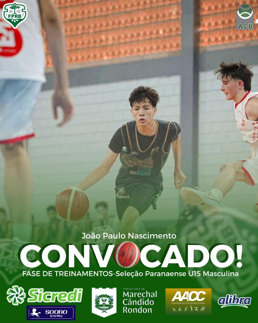 No primeiro trimestre de 2025, a Pref. Mal.C.Rondon/AACC/ACB já possui grande representatividade quanto às convocações em Seleções Paranaenses. Só em abril já foram 4 atletas convocados para os treinamentos da Federação Paranaense de Basketball, Alana Gehlen(sub16); Heitor Cardoso(sub16); João Paulo Nascimento (sub15) e Clara Azevedo(sub13). Além disso, a professora Kauanny Schmidt foi chamada para compor as comissões técnicas das seleções sub16 e sub13 feminina!
